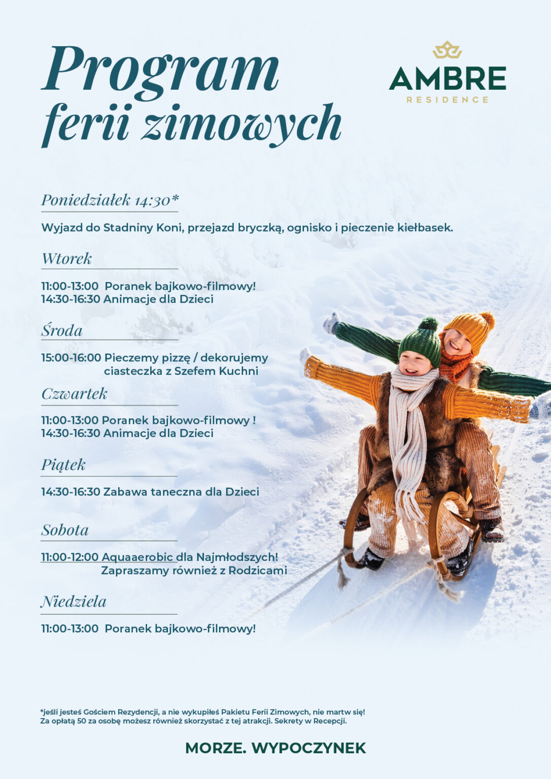 Odpocznijcie od codziennego pośpiechu i spędźcie zimowy czas w przytulnej Rezydencji Ambre. Ciepła atmosfera, kreatywne animacje, zdrowe posiłki i morski klimat – idealne połączenie dla całej rodziny.